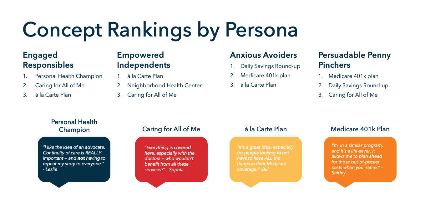 The team tested the concepts in the field with 21 age-ins who were recruited based on their identification with one of the 4 key personas defined by market research. The following breakdown shows the top concepts as ranked by each persona type:
