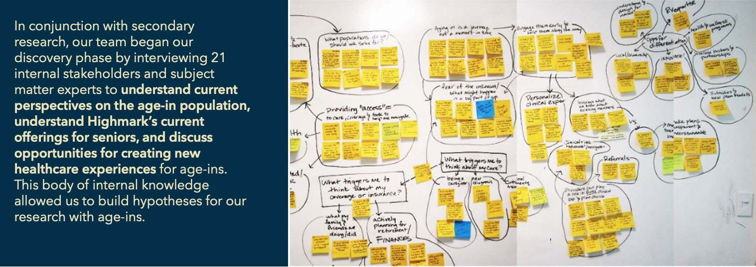 The design team then moved into the define phase, where we brainstormed several potential concepts and opportunities to meet the needs and expectations of age-ins, based on our primary and secondary research, and the personas developed from BCBSA’s market research.