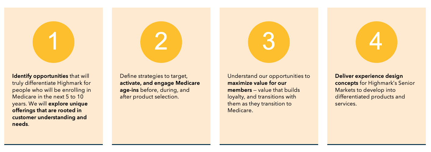 With over 60 million Americans enrolling in Medicare every year, Highmark’s healthcare offerings for seniors face strong competition in the market. To stay competitive, Highmark must create differentiated experiences, services, and solutions for people aging into Medicare in the next 5 - 10 years.