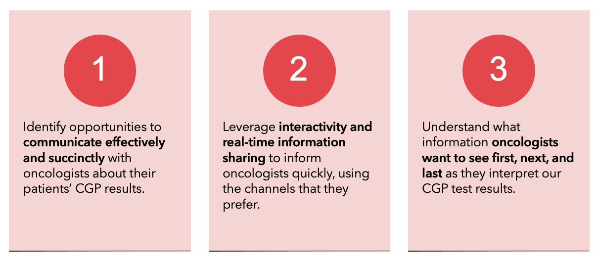 The initiative to refine Foundation Medicine’s methods of communicating genomic testing results came from a deep dive into how oncologists work, their varying levels of familiarity with this type of testing, and what they might need to make the the next best clinical decision for their patients.