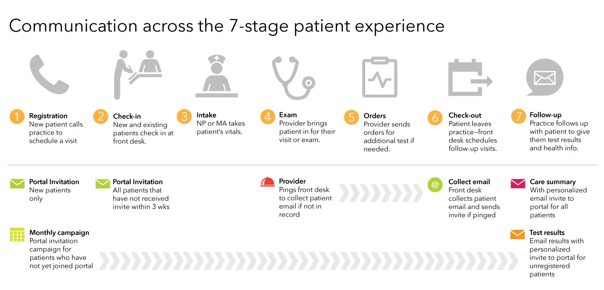 I began the first phase of the design by exploring how medical practices can communicate with their patients across the exam experience. I identified options for how and when a practice can encourage patients to adopt the Patient Portal as a means of communication with their doctors.