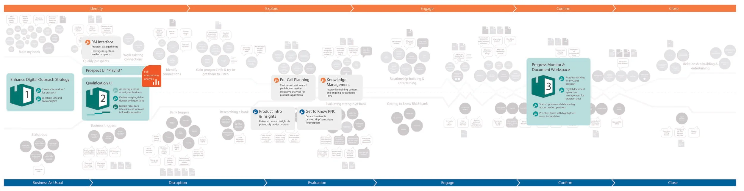 The project began with developing an understanding of corporate client needs, through the eyes of PNC's bankers, and through in-person research with recent clients. We began by hosting a workshop with PNC corporate bankers to understand what the sales process with prospective customers is like, through a focused journey-mapping session: